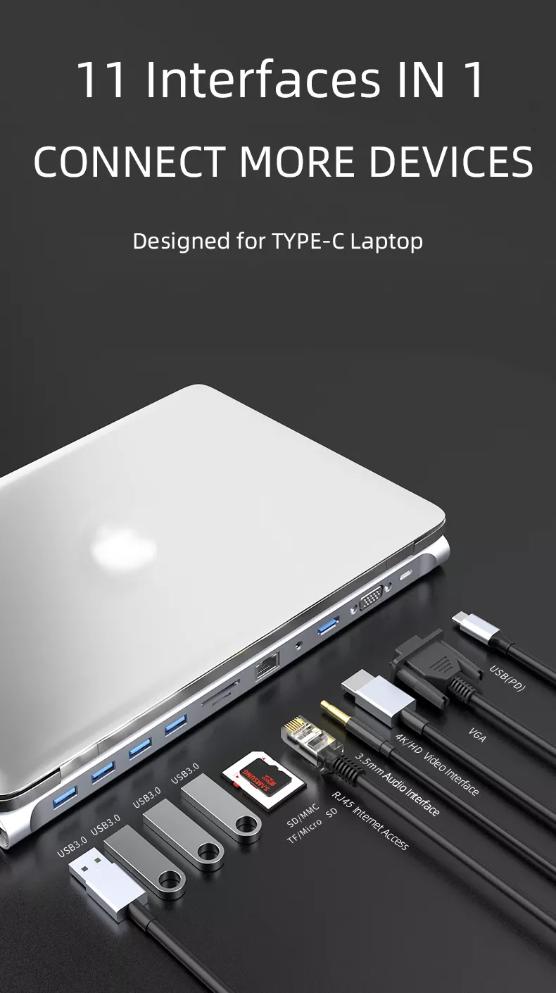 11 in 1 Docking Stations USB3.0+USB2.0*4+USB-C PD Charging +HDTV 4K HD+VGA+100mpbs+DC3.5mm +TF/SD USB-C Hub Adapter Laptop